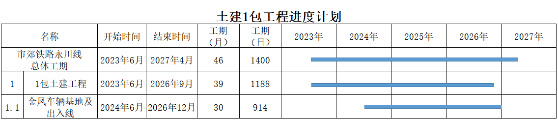市郊铁路重庆中心城区至永川线工程计划施工总工期60个月。本招标项目计划于2023年6月30日开工,计划1188日历天按合同约定实施和完成本承包工程。