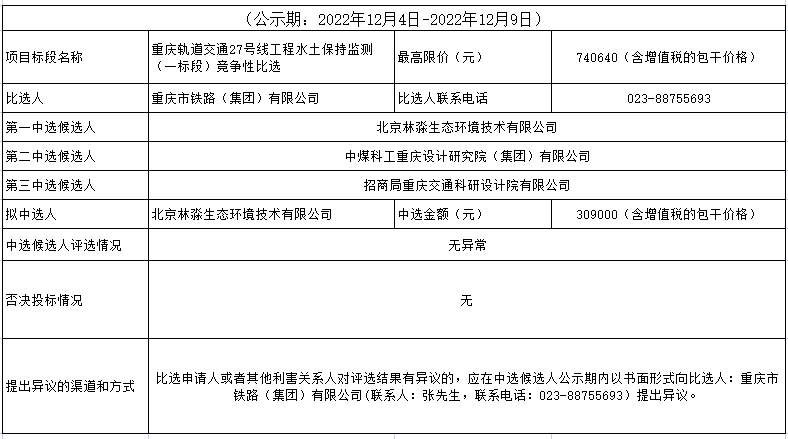 重庆轨道交通27号线工程水土保持监测(一标段)竞争性比选结果公示表