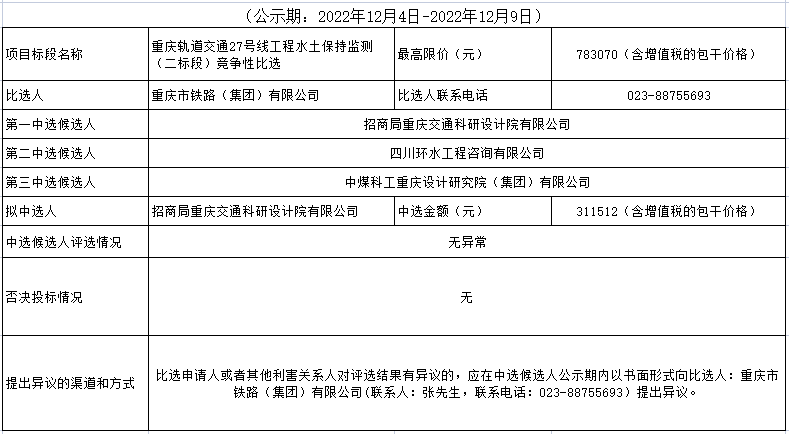 重庆轨道交通27号线工程水土保持监测(二标段)竞争性比选结果公示表