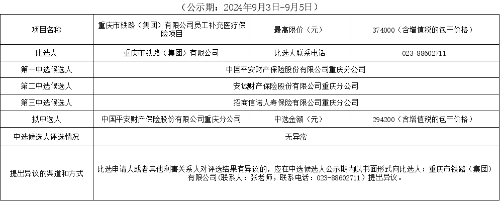 重庆市铁路(集团)有限公司员工补充医疗保险项目竞争性比选结果公示表