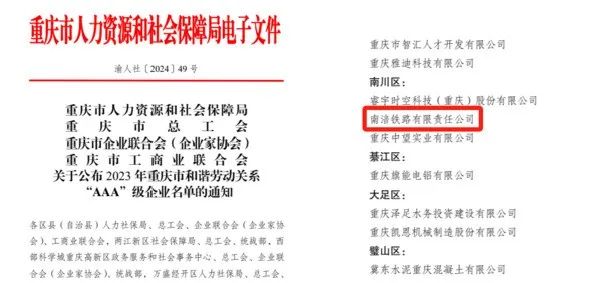 近日,重庆市人力资源和社会保障局、重庆市总工会、重庆市企业联合会(企业家协会)、重庆市工商业联合会发布了《关于公布2023年重庆市和谐劳动关系“AAA”级企业名单的通知》(渝人社〔2024〕49 号),表彰了一批有力维护和谐劳动关系、切实保障职工权益的优秀企业,市铁路集团南涪铁路公司榜上有名。