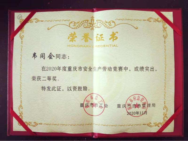 集团韦同会获得“重庆市安全生产劳动竞赛”先进个人二等奖