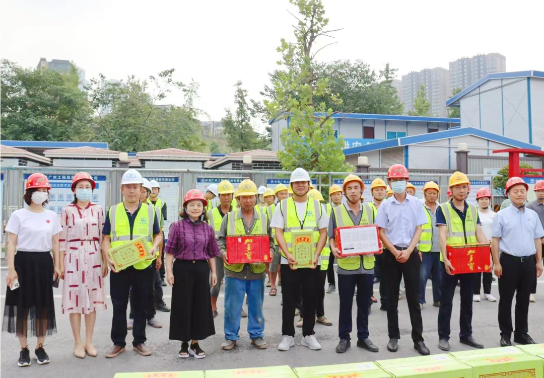 在15号线九曲河东站施工现场,周俊勇对高温期间坚守岗位的工作人员表示感谢,并叮嘱大家做好个人防护,注意劳逸结合,以自身安全保障项目安全。随后,周俊勇、陈静、何明成将防暑清凉慰问品送到现场一线建设人员手中。