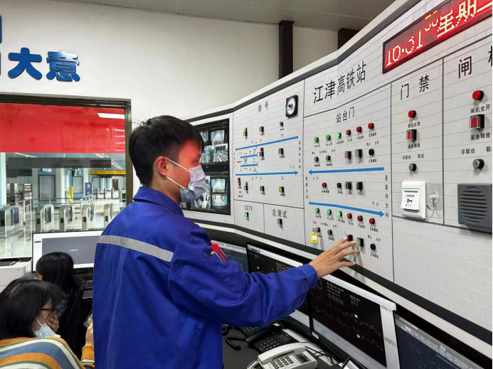产业公司江跳线维管项目九龙园机电工班机电综合检修工、团员青年葛志翔正在检查江津高铁站ABP盘站台门控制功能