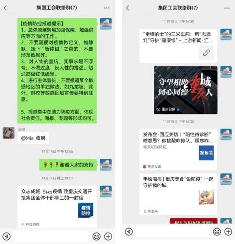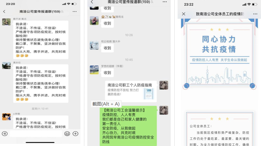 集团工会闻令而动,第一时间吹响抗疫“集结号”,组织各级工会第一时间将上级的疫情防控部署要求传达到每一位职工,引导职工正确理解各项防控政策和制度精神,号召广大工会干部、劳模先进和职工群众全面行动起来,众志成城,携手战“疫”,筑牢疫情防控安全防线。
