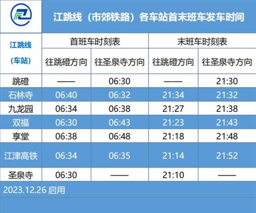 根据客流变化特征,江跳线将从2023年12月26日起优化列车运行图,延长运营服务时间。