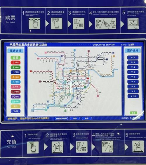 TVM,全称叫做“自动售票机”。TVM最下方的第一个选项为“搜索站点购票”,输入站点首字母即可快速锁定目的站点,(例如:目的站点为“小什字”即输入XSZ)。第二个选项为“充值”,选择现金、微信、支付宝进行支付。第三个选项是“验卡”,可以快速查询卡内余额。主屏幕上还呈现有重庆市完整的轨道交通线路图,可缩小放大,便于大家更好地规划出行路线。