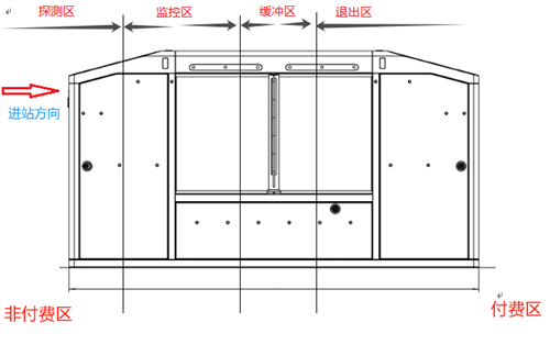 闸机通道从通行方向分为探测区、监控区、缓冲区、退出区。